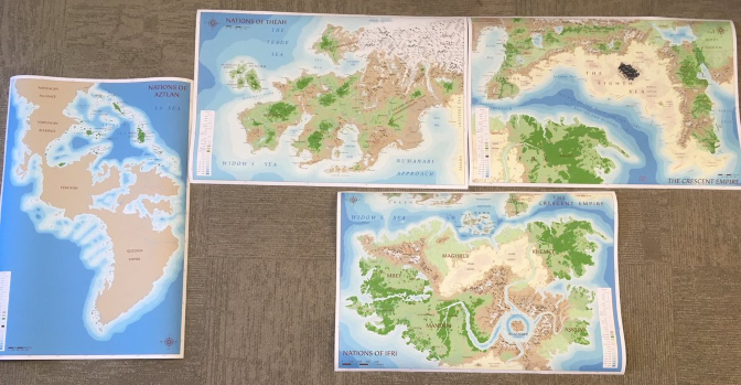 Need to take a look at the maps in progress thus far? Oh if you want to see the bigger image, you can find it HEREJust for clarification, left side is the New World, middle is the Theah we all know and love, bottom is Ifri, right side is Crescent Empire.